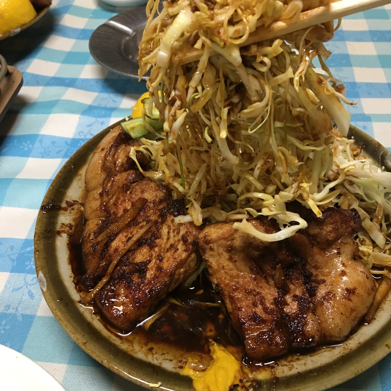 ☆ 山盛りキャベツの上には厚切りロース肉2枚!やっとの思いで食べきり~思い出しました!「コレをたのんでは駄目なんだ」