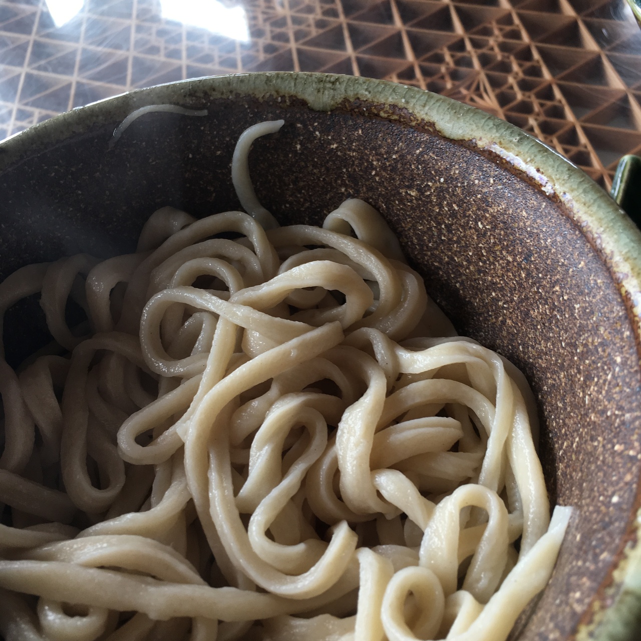 地粉の太打ちうどん~注文から提供されるまで時間がかかります(太いうどんだからね)!並盛りで600グラム(大盛りです~)ネギ豚つけ汁がおススメです。。腹いっぱいになって、残りはお持ち帰りして、焼うどんの夕飯です(二度美味しい)イェ~!