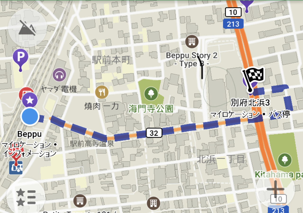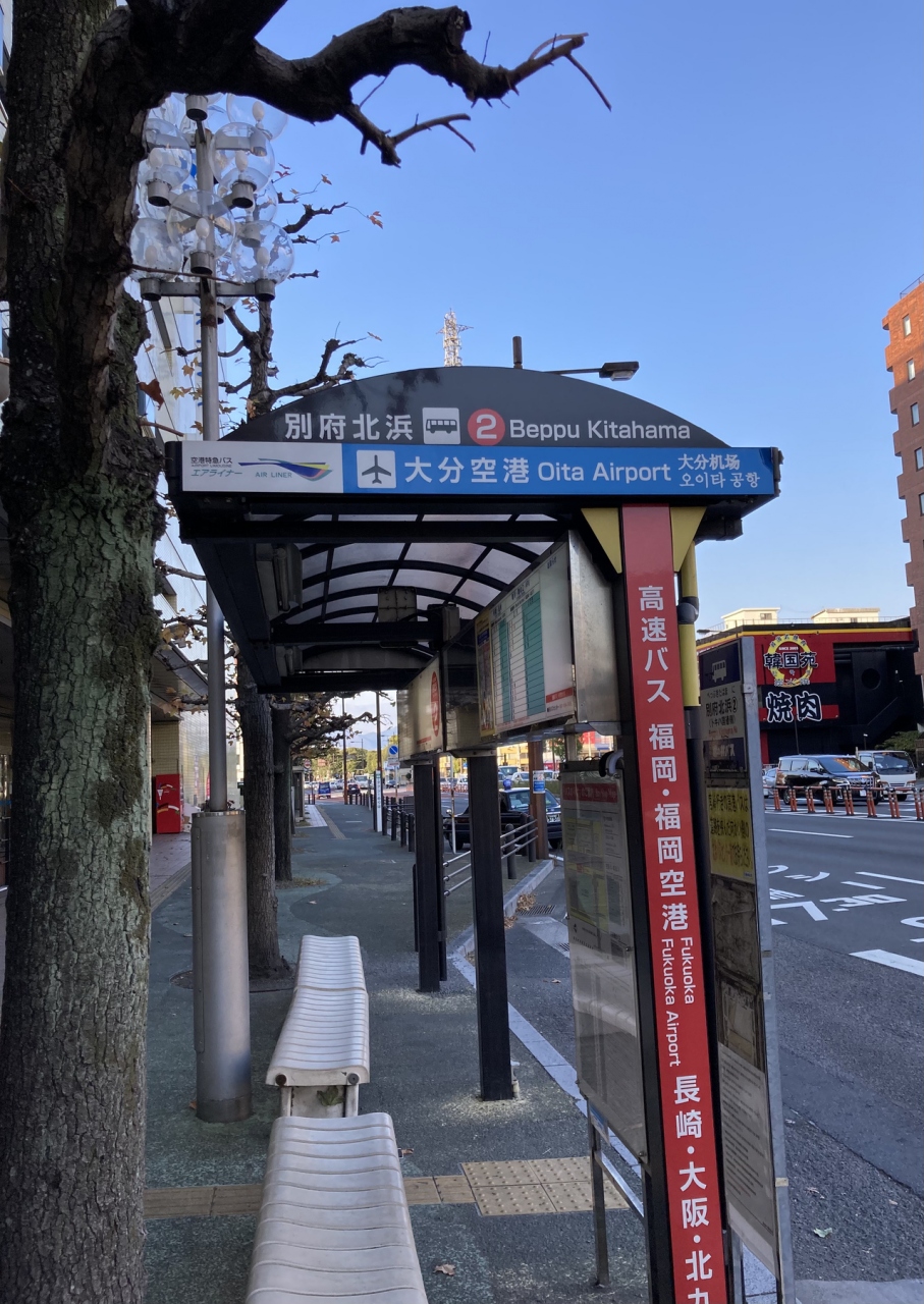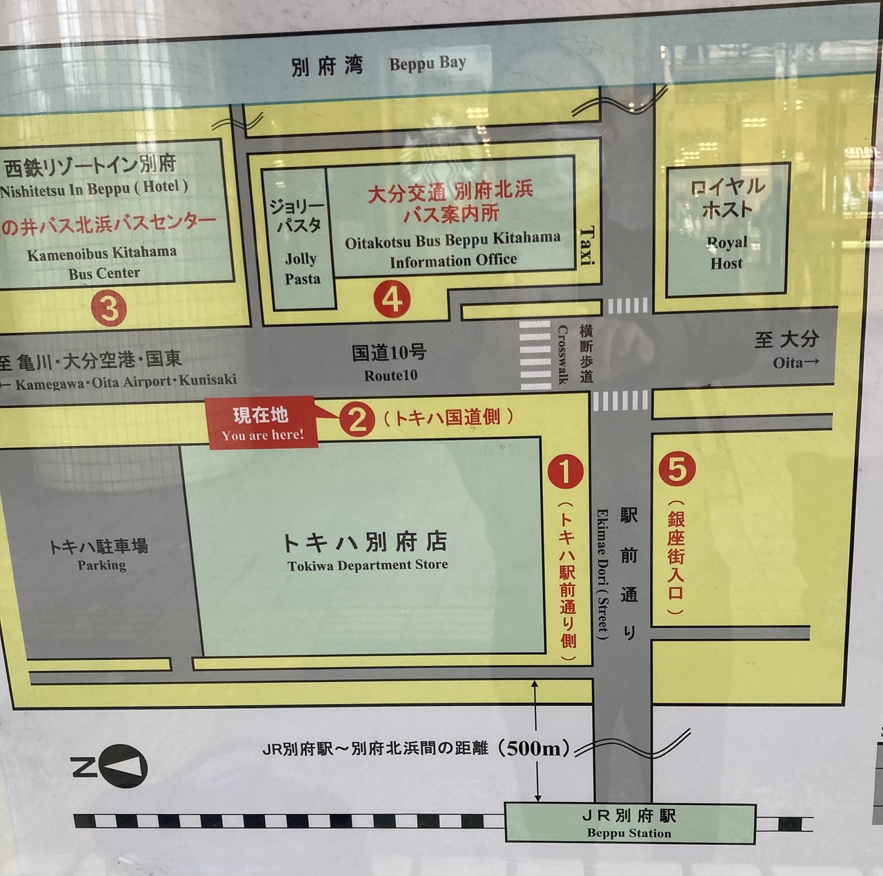 別府駅から徒歩(北へ)10分に有った【大分空港高速バス停】←案外見つけ辛かった(トキハと書いてトキワと読むローカルBig百貨店の北側)