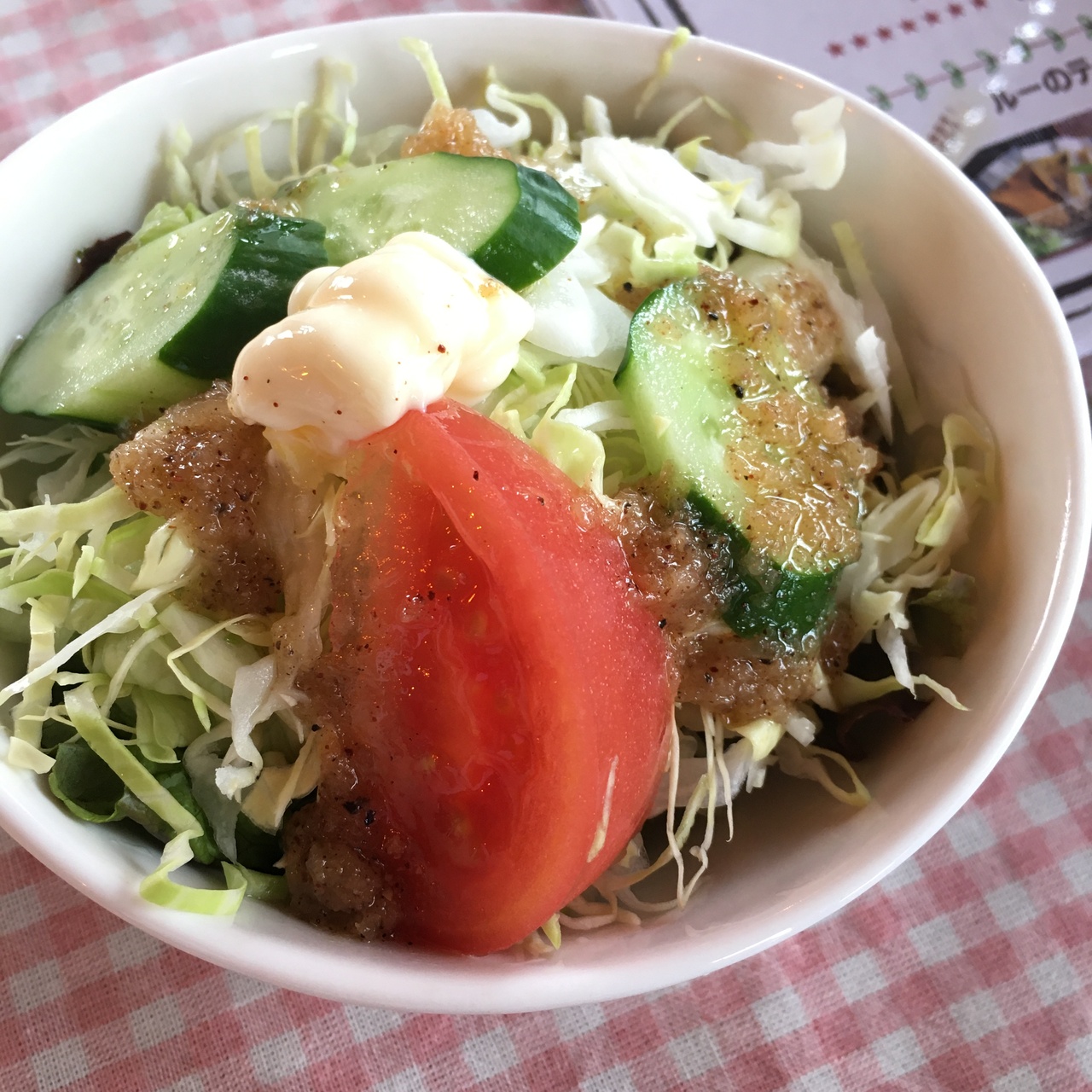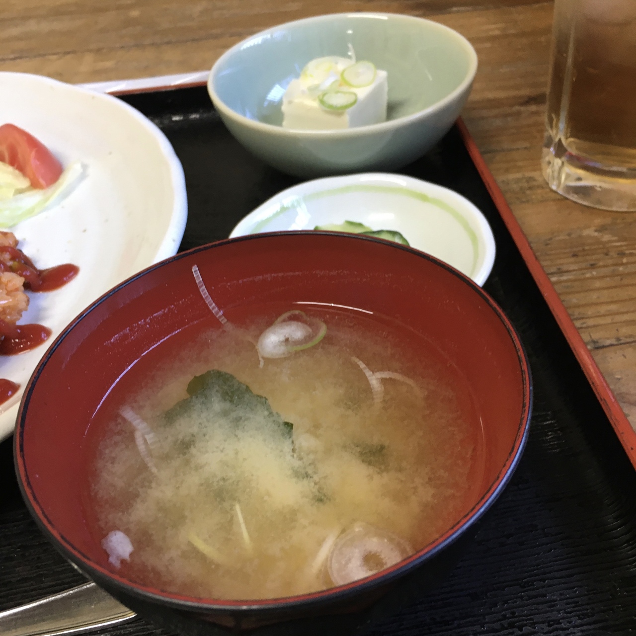 出て来た水が旨い、フレンチドレッシングがフレッシュ、ヒレカツがパサパサして無い、赤いマグロがねっとり、ほうじ茶でサッパリ。。