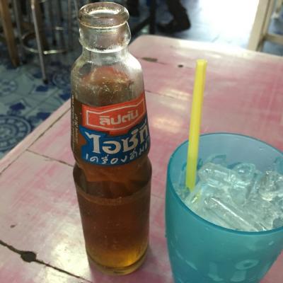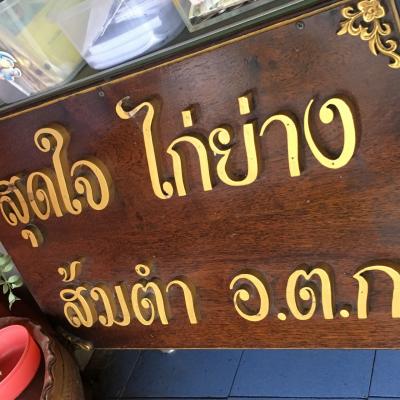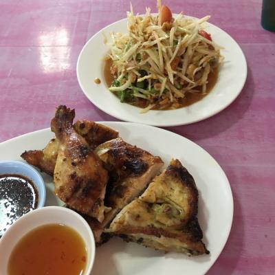 オートーコー市場の駐車場に有る、スッチャイガイヤーン ソムタム です!ガイヤーンは 甘辛と酸味の2つのタレで 交互につけて食べると 飽きなくて旨い。ガイヤーン・ソムタム・ガイヤーン・ソムタム・ガイヤーン・ソムタム・・・、止まりません!ビン入りのリプトンが やけに美味かったりして、、