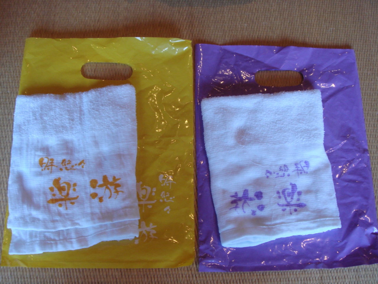 最近は、ゆかたを選べる宿は多いようですが、他にもとても心配りが行き届いている宿でした。スリッパは使い捨てで、他の人と間違えないよう自分で印を書けるようになっていたり、大浴場に行くための籠バッグが一人ひとり用意されていたり、お風呂で使うタオルは字の色が違い、字の色と同色の袋に入れられていました。また、バスタオルは更衣室に用意されており、何度温泉に入っても乾いたバスタオルを使うことができました。