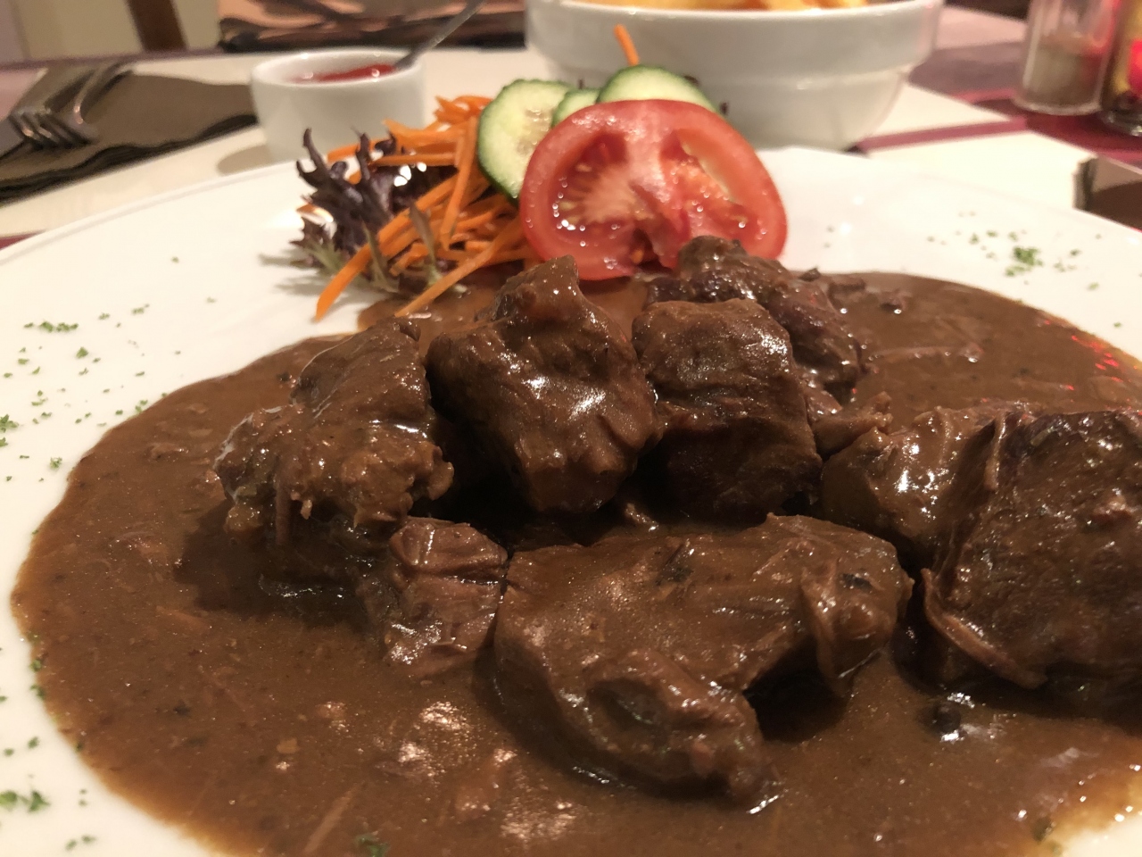 そして、ブリュージュ名物カルボナード・フラマンドを注文。名物カルボナードは、なんと黒ビールで柔らかく煮込んだ牛肉料理。本当に柔らかくて、美味しいです。