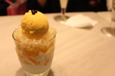 マンゴーアイスやゆずの寒天などであしらったデザートです。