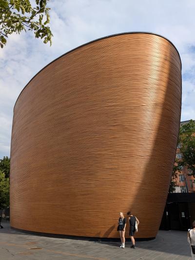 とてもユニークな形をした教会です。モミの木を曲げて作られた外壁。木をこ...