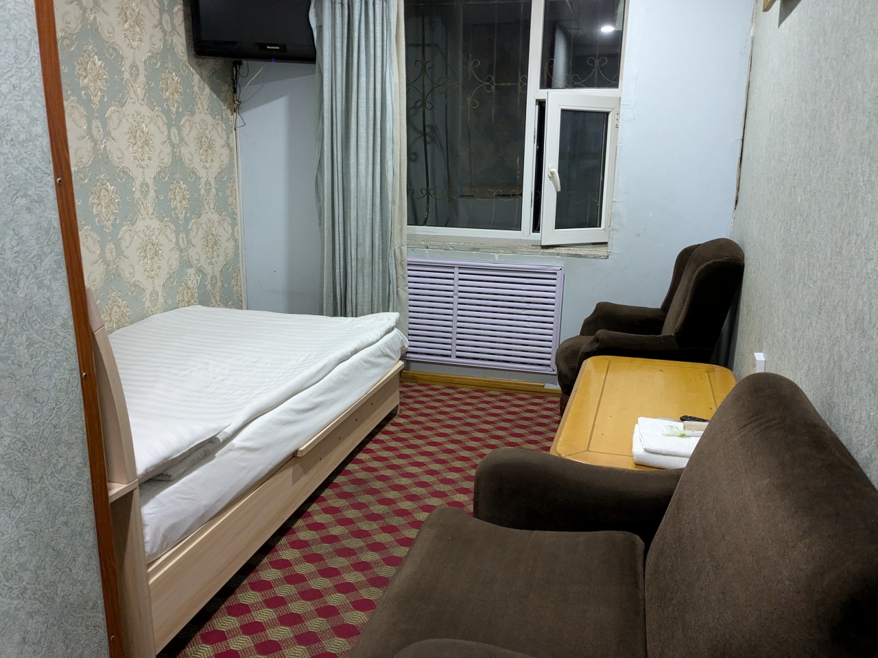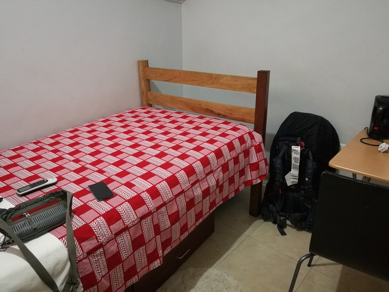 - 狭いが、冷暖房、冷蔵庫、テレビ、机、ティーポット、ベッドの下にはちょっとした収納ダンスがあり、すべてそろっている。