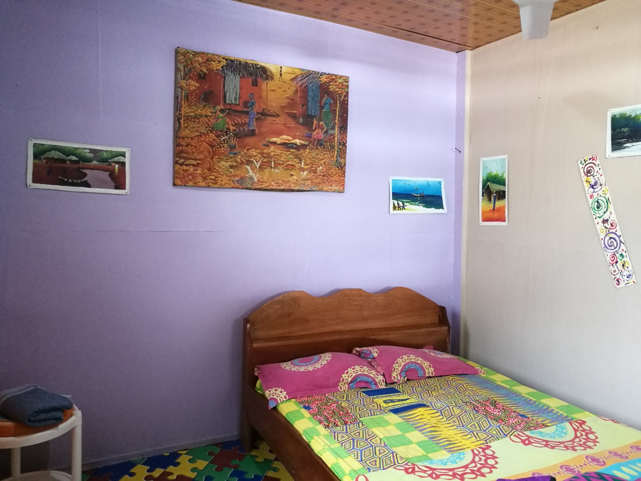 この宿の特筆すべきことは、おそらく場所の分かりづらさ。宿がランドマークにしている"Benin Control"はドライバーはわからず、ドライバーが道行く人に聞いても分かる人がおらず、最後は宿に電話して電話口で案内してもらっていました。そこで、私が滞在中に見つけたランドマークは"immigration"(イミグラシオン)。これであれば、だれでも分かります。徒歩10分かからないので大丈夫。まずは、空港からでも国境からでも、ドライバーに「イミグラシオン」と伝えましょう。着いたらそこを背にして、右方向に進みます。少し歩くと携帯電話会社の"MOOV"にぶつかります。そこを右に曲がり、まっすぐ行くと"MAQUIS"というレストランにぶつかるので、そこをまた右に曲がって進んでいくと右側に「55」という家の番号が宿です。