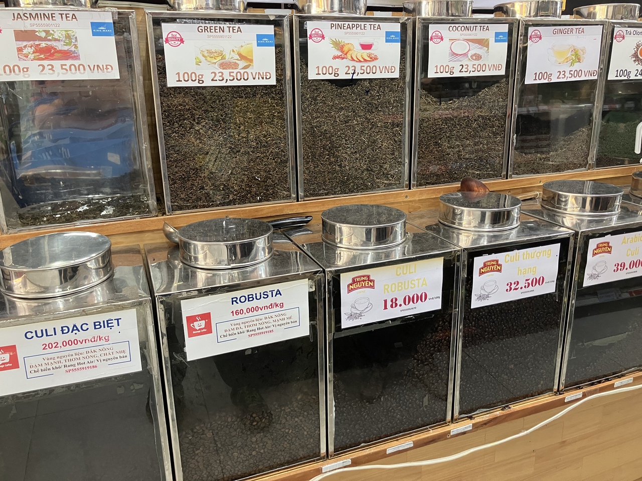 フォーの乾麺、お茶っぱ、コーヒー、調味料、特産の胡椒、グラインダー付きのお土産用の瓶入りのものが手に入ります。