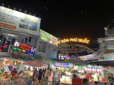こちらは新しい看板で「チョデムフーコック」(フーコック夜市)という電飾看板がかかっており、2筋にわかれてグエンチュンチュック橋の方向にむかって伸びています。既存クチコミもほぼ同じ場所として扱っているので、このまま区別せずに投稿しますが、厳密にいうと4トラベルの掲載情報は違う場所です。