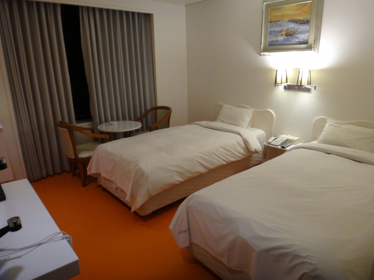 古いホテルだそうで施設はかなり年季が入ってましたが、我々の泊まった部屋は結構広くて落ち着けました。ベッドはセミダブルとシングルの2つ、クローゼットスペースも広くて着替えをしまう引出もちゃんとあって設備はなかなか充実してたと思います。清潔だし、バスルームの水量、水はけなども含めて総じて何も問題なかったです。そうそう冷蔵庫が大きかったのが我々にはポイント高かった。今回はスーパーでも市場でもキムチを大量に買い込んだのですが、帰国まで全部しっかり保存できました。冷凍スペースもあったので保冷材の冷凍も可能です。
