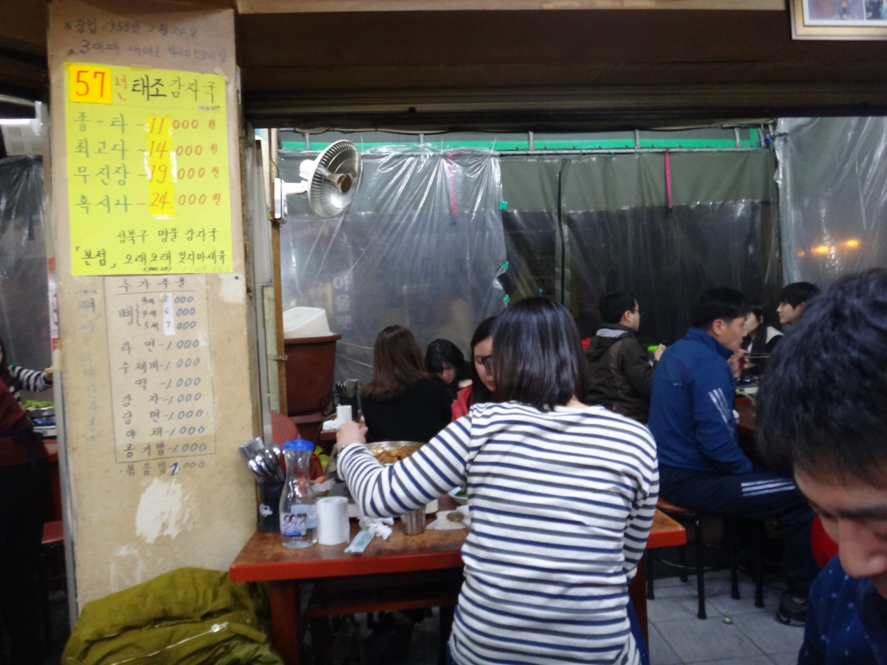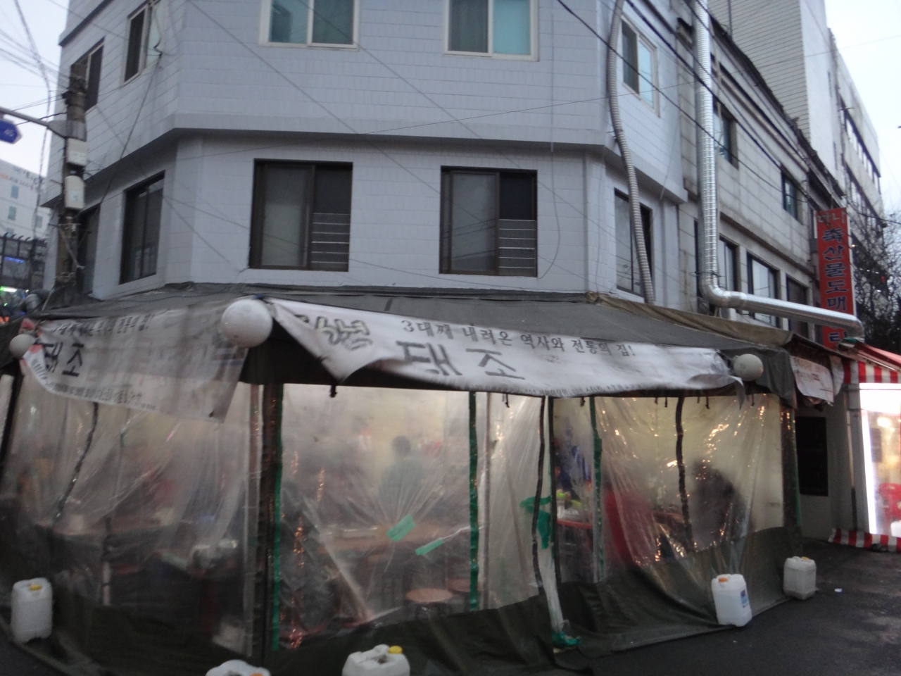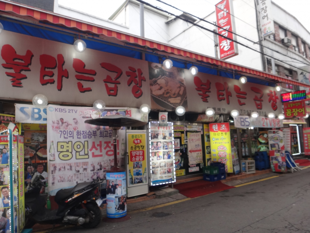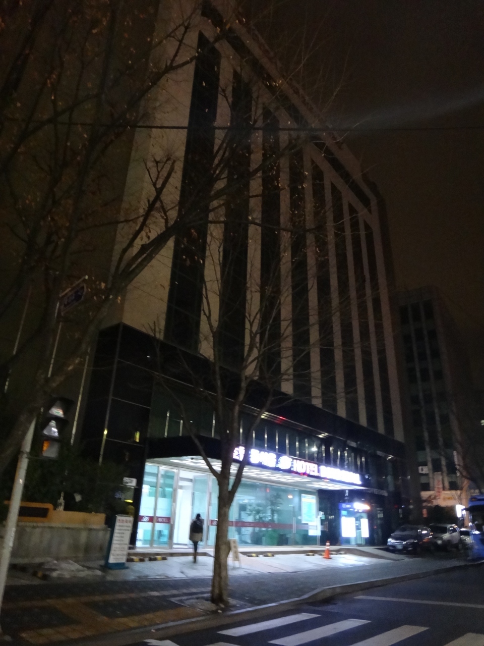 郊外の東ソウルバスターミナルのすぐそばにあって辺りはマンションがいっぱいあってベッドタウンのようでしたが、ホテルの周りには焼肉屋やソルロンタン屋、キンパ屋などめぼしいものはひととおりあって、屋台街も充実してました。行ってないですが九宜のハッピーデイスパも徒歩圏(10分くらいかな?)だと思います。