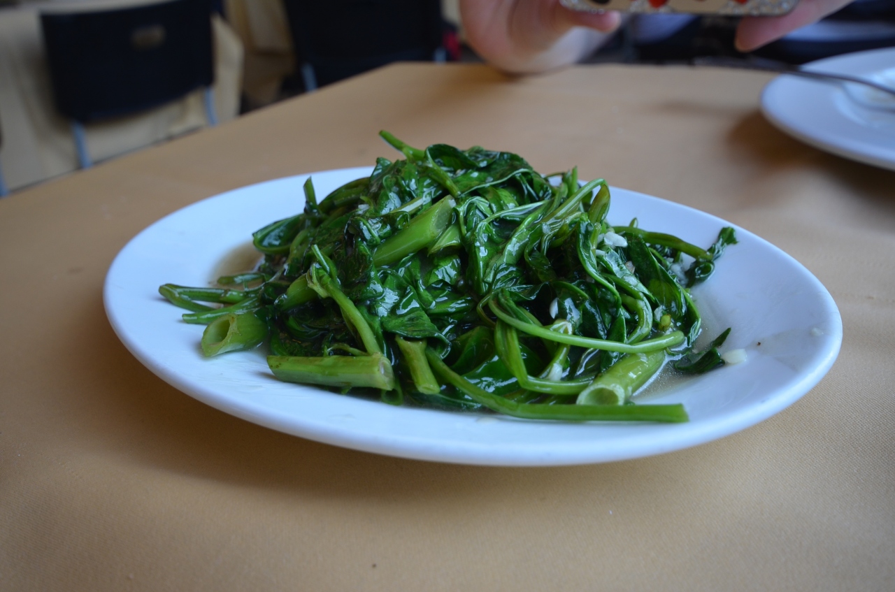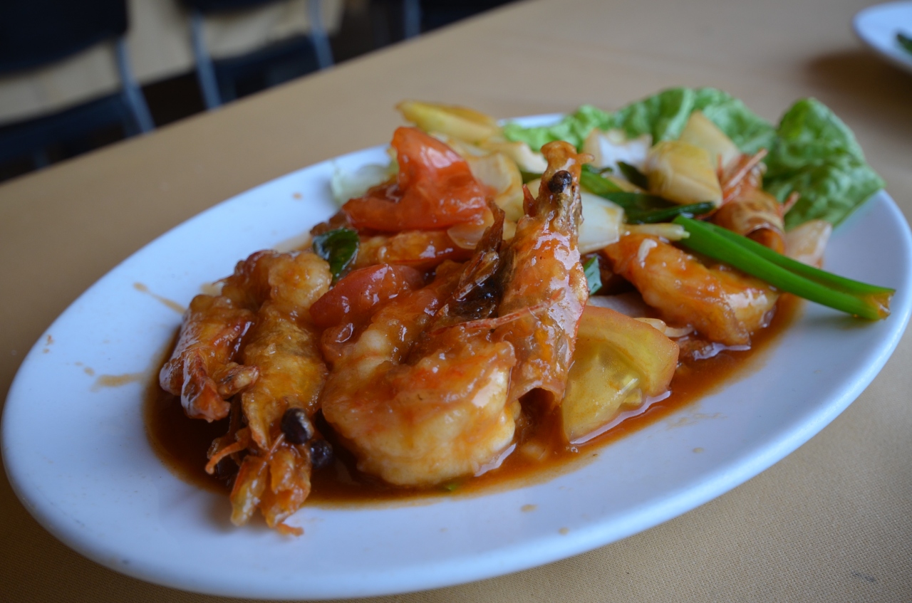 オーダーしたのは四川風焼きそば、空芯菜のガーリック炒め、海老の甘酢、そしてタイガープロウンのバター揚げでした。すごくボリュームあり!!他の方のブログではこれにチャーハンも頼んでおられるカップルがおられましたが、少食の私たちではどんなに頑張っても上記4品目で限界だったので気にはなっていたものの、チャーハン削除で正解でした。