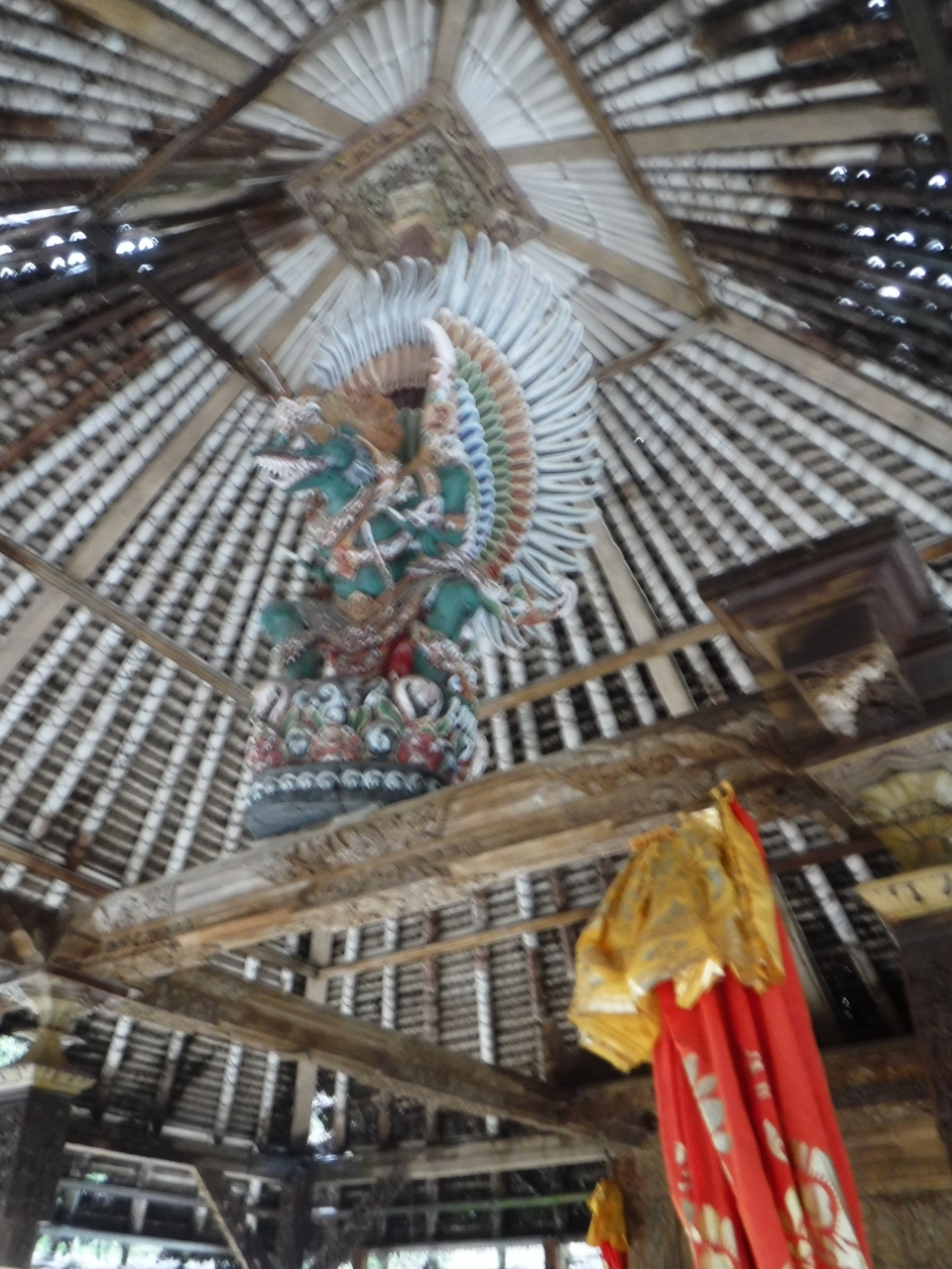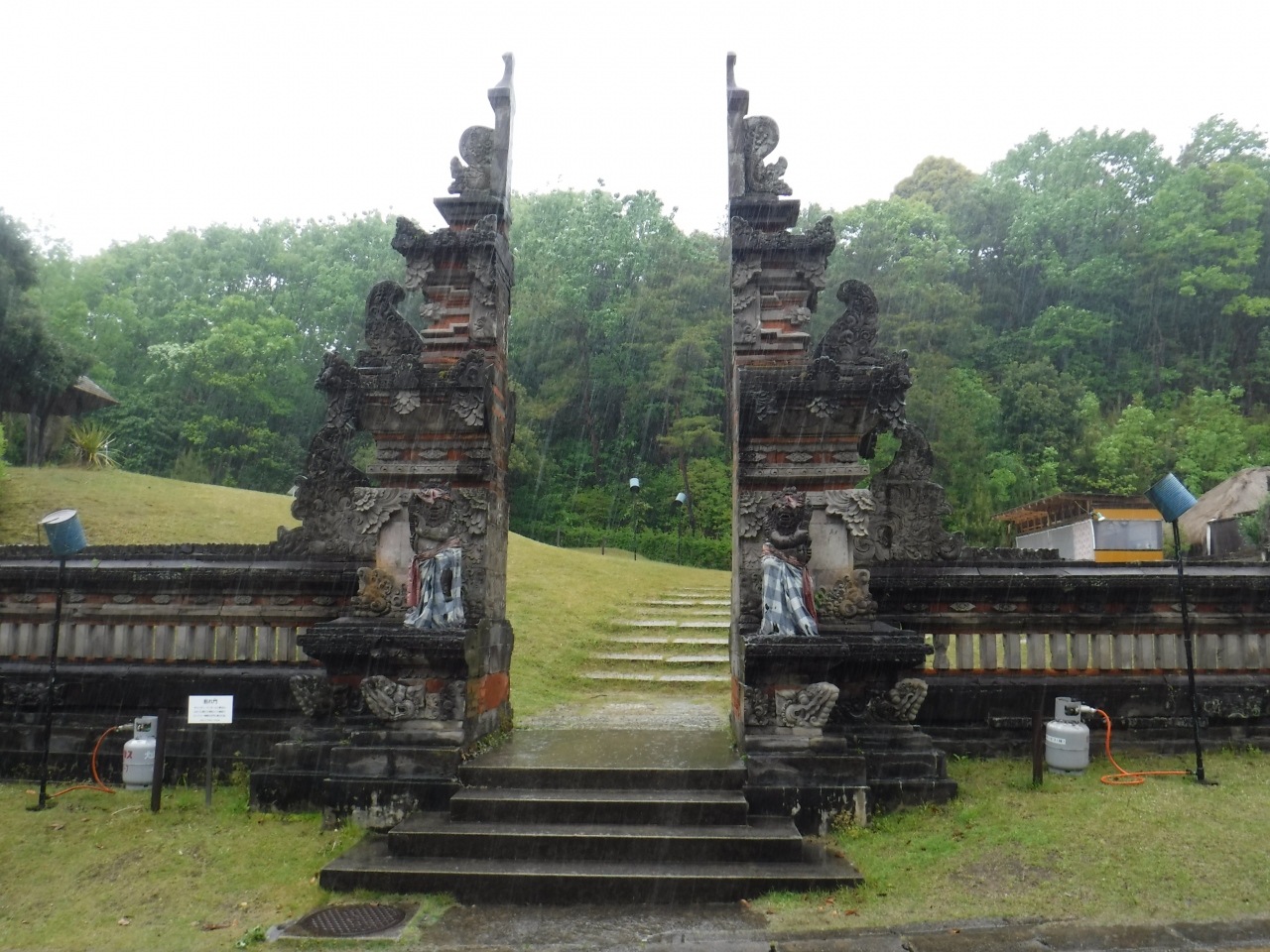 煉瓦の塀に囲まれている貴族・僧侶階級の屋敷です。敷地は大きく3つに分けられています。いちばん奥はヒンドゥーの神々や祖先をまつる祭祀場、中央は儀礼の建物を中心に寝室、穀倉、台所といった生活の場、手前はお祭りや儀式のときに余興として踊りやガムラン演奏をする場でそうです。儀礼の建物の上の方に鮮やかな色彩のガルーダがいます。- 旅行時期