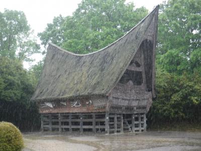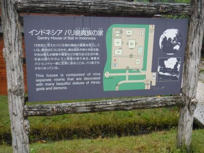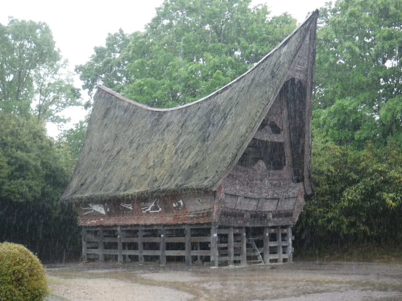トバ・バタック族の家は、バリ島貴族の家からちょっと先に進んだところにある大きな建物で、1947年に建てられたものを移築したものだそうです。高床の仕切りのない部屋に父系親族を中心とした人びとが住んでいたそうです。建物の外壁には歴史を記した絵が描かれています。大戦中を描いたと思われる、飛行機が描かれた絵がありました。