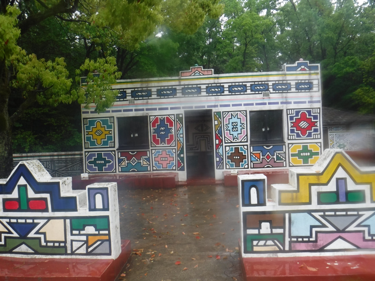 ンデベレ族は南アフリカ共和国の内陸の標高900~1500mの高地に住んでいます。色鮮やかな幾何学模様の壁絵で飾られた家屋が特徴です。壁絵は水性ペンキで描かれ、主に女性たちよって、フリーハンドで描かれています。壁絵は身の回りの物をモチーフに描かれているそうです。ンデベレの家がつくられたのは1995年頃で、当時、壁絵を描いているのを見た記憶があります。