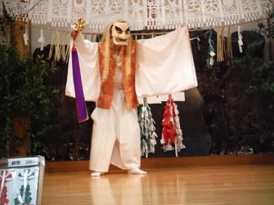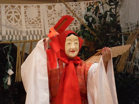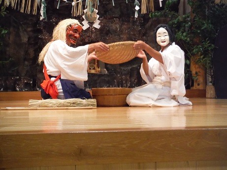 最後の「御神体の舞」は、 伊弉諾尊と伊弉冉尊の二神が新穀で酒をつくって神前にささげる神楽で、お互い仲良く酒を飲んで抱擁し合う、夫婦円満、子孫繁栄、五穀豊穣を祈願する舞です。