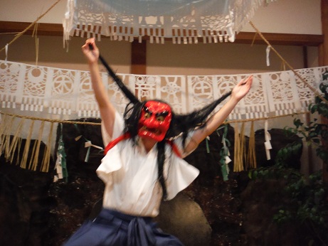 「戸取の舞」は、手力雄命がたすきを掛ける力に充ちた舞です。面の汗をはらい黒髪をふり乱して渾身の力を込めて岩戸を取りはらう荒々しい神楽です。