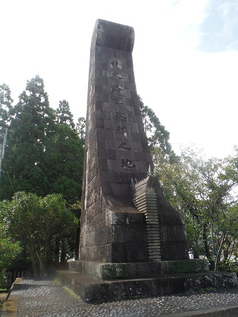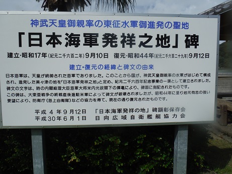 神武東征の際に、ここ美々津の港から船出をしたと言われています。、その伝説から神武天皇御進発の聖地という意味での海軍発祥の地と言われています。 石碑の文字は海軍大将米内光政の手になるもので、戦後しばらくは消されていたそうです。また、碑の前には古代の軍船が飾られています。- 旅行時期