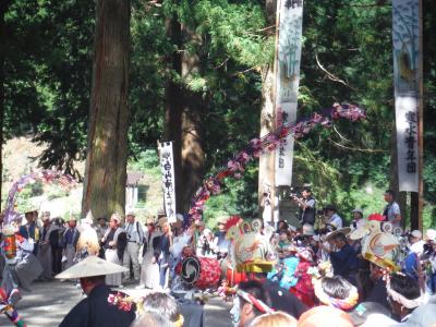 郡上市の寒水(かのみず)地区の白山神社の祭礼で奉納されます。以前は旧暦に基づいて行われたため、祭りの日が一定ではなかったのですが、このご時世、平日にはできなくなったためでしょうか、9月の第2日曜とその前日に行われるようになりました。総勢100人を超える男性によって行われ、その主役ともいえるのが、背中に「しない」とよばれる竹を背負った若者です。彼らは体を深く折り曲げ、「しない」で地面を掃くように踊ります。