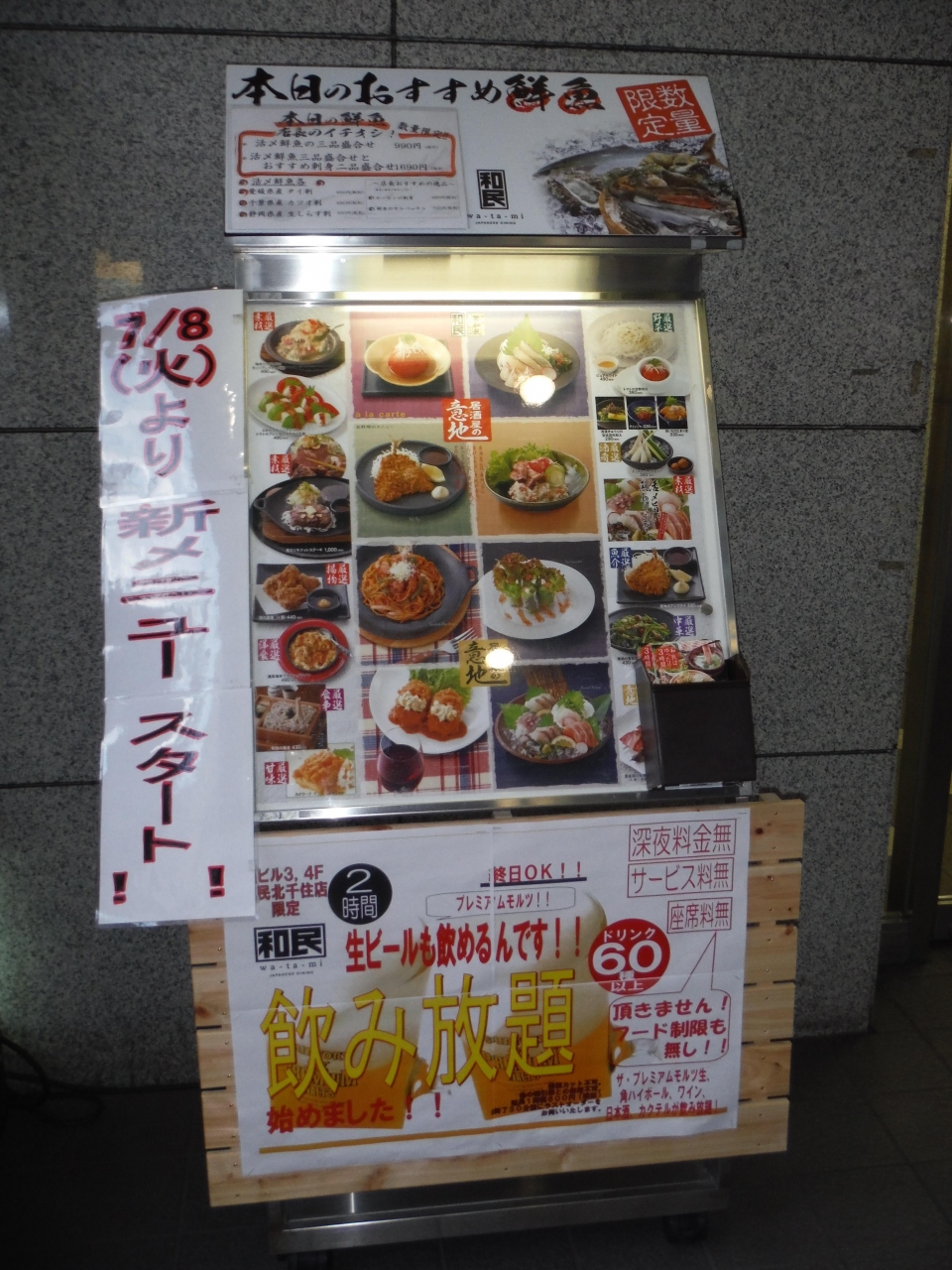 北千住の駅から歩いて5分ほどのビルにあります。1200円から飲み放題がありますが、訪れた時は1500円のプレミアム飲み放題にしました。料理はさすがに居酒屋的メニューがあれこれ、「さくらユッケ」が美味しかったです。