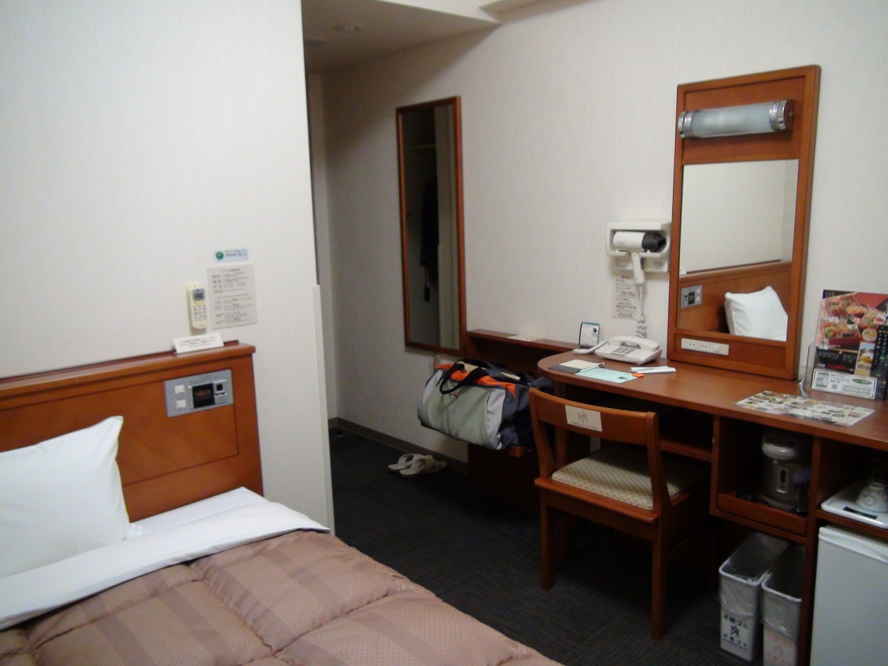 JR東海道本線藤枝駅北口から歩いて7・8分程度。ホテルのすぐ近くにはコンビニもないけれど、駅まで行けば食事をする場所も、コンビニ等も色々あります。部屋はまあ普通のビジネスホテルの風情。1階に大浴場があります。部屋の電話を外線で使ったら、実際には通じなかったのに、施設使用料を20円取られた。