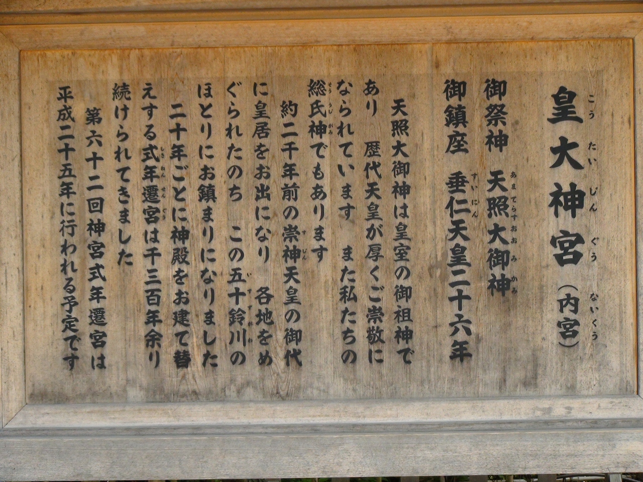 正式名称は皇大神宮。御祭神は天照坐皇大御神。三種の神器の一つの「八咫鏡」が奉安されている。別宮として、境内に荒祭宮と風日祈宮、境外に月讀宮、瀧原宮と伊雑宮のほか、多くのの摂社、末社、所管社を有している。20年に1度、式年遷宮が行われ、社殿を初めとして神宝などすべてが新たにされる。三重交通バスが内宮前まで走っている。自家用車の場合は、宇治橋周辺の参拝者用駐車場を利用することになるが、混雑時には進入禁止の規制が行われる。また、初詣の期間やゴールデンウイーク期間中はパークアンドライドが実施される。