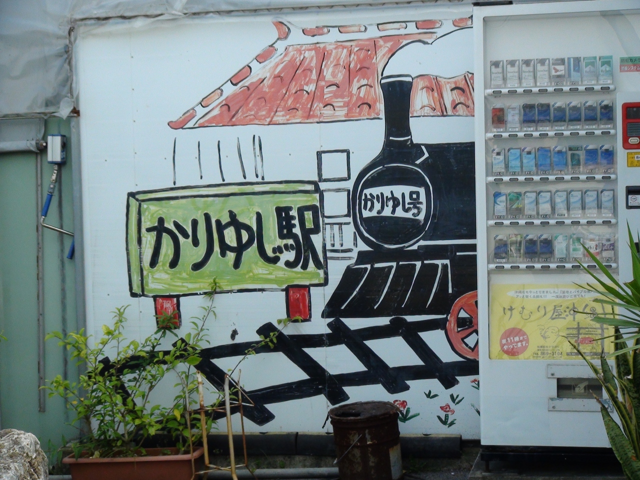 軽便とは、かつて沖縄にあった交通機関のこと。通常は「けいべん」と読みますが、沖縄では「けーびん」と読まれたそうです。狭軌よりも狭い軌道で嘉手納まで走っていたそうです。その汽車の絵が描かれています。売られているのは地元で捕れた野菜や果物が中心です。ものによってはうまんちゅ市場などよりも安いものがあります。時期になればマンゴーなどもお勧めですが、ここのものは自家消費用と考えるとよいと思います。