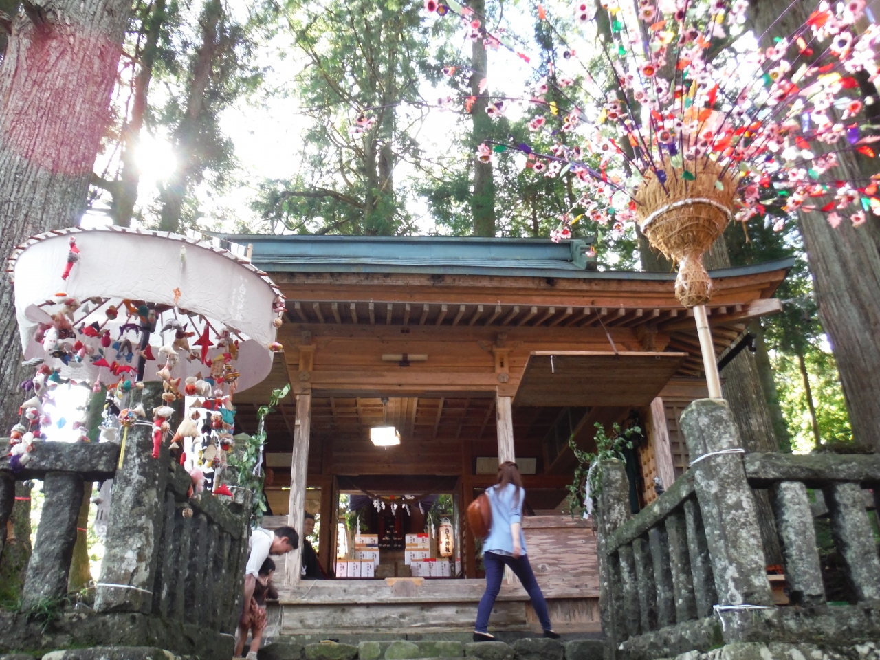 郡上市の寒水(かのみず)地区の白山神社の祭礼で奉納されます。以前は旧暦に基づいて行われたため、祭りの日が一定ではなかったのですが、このご時世、平日にはできなくなったためでしょうか、9月の第2日曜とその前日に行われるようになりました。総勢100人を超える男性によって行われ、その主役ともいえるのが、背中に「しない」とよばれる竹を背負った若者です。彼らは体を深く折り曲げ、「しない」で地面を掃くように踊ります。