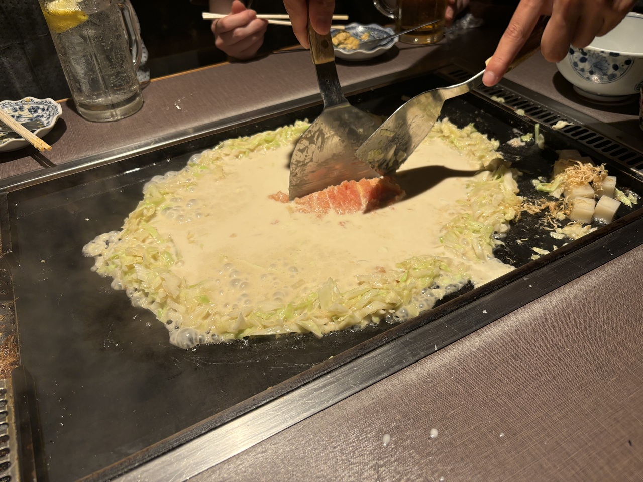 各テーブルの鉄板で店員さんが焼いてくれるので、もんじゃの焼き方がよく分からなくても