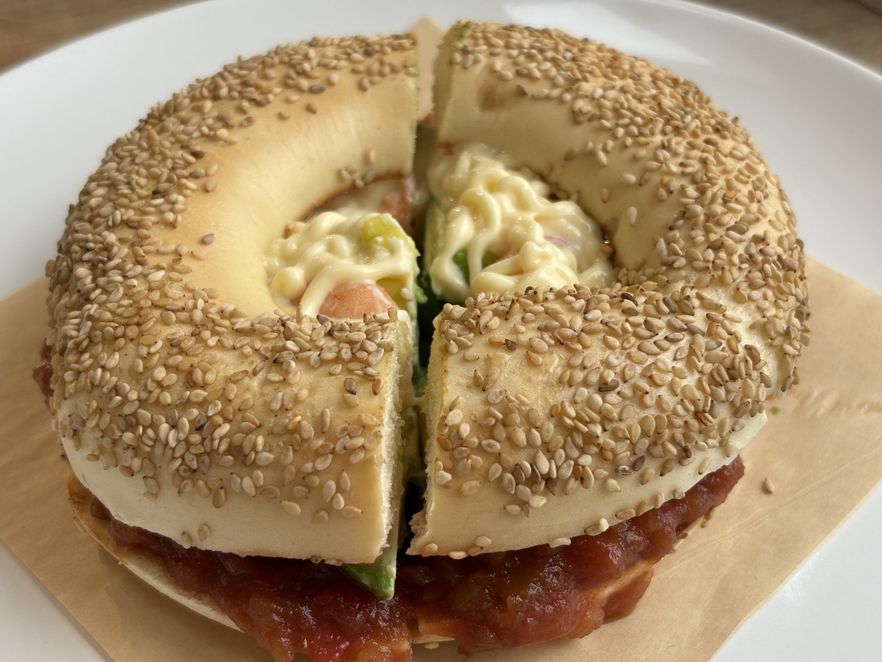 生地がほんのり甘くて美味しいベーグルです。表面カリカリ、中身もちもちです。