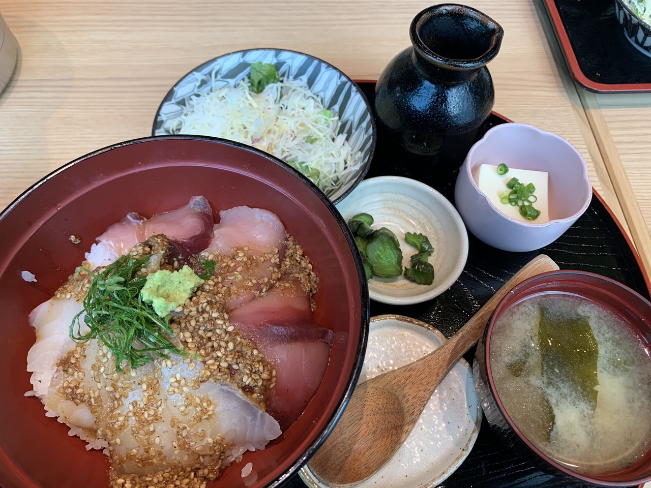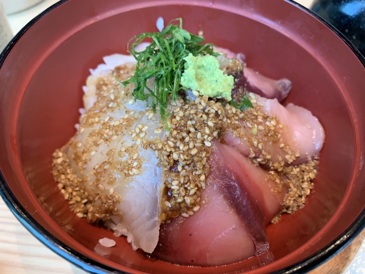 この日は鯛と鰤2色丼ぶり 1,300円を頂きました、厚みのある鯛と鰤にゴマがたっぷりかかっています。途中からだし茶漬けにもできるので