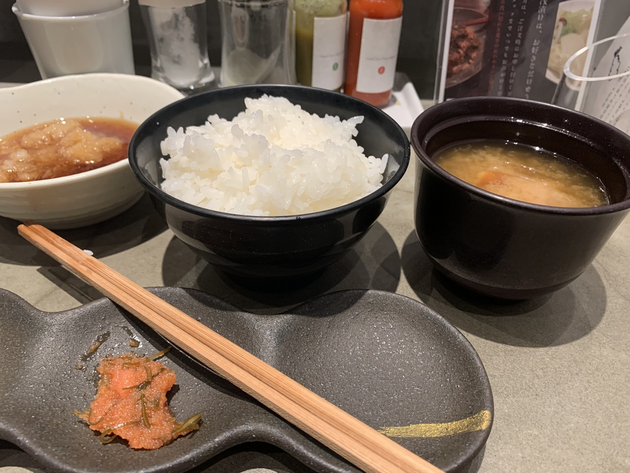 乃セット。ご飯はおかわりできます。明太子と昆布の合えたものと、お新香は食放題です。