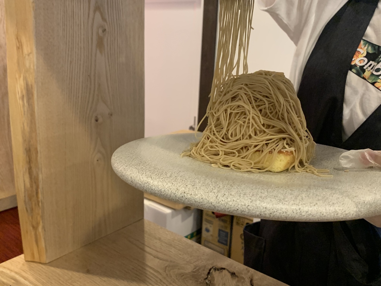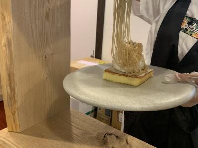 カステラの上に焼きメレンゲがのっていて、そこにモンブランクリームを盛り付けます。