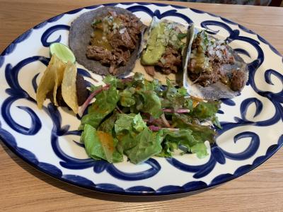 3種のタコス(チキン・ビーフ・ポーク)にスープが付いているランチセット\1000(税込)を頼みました。もっちりしたタコス生地に具材がたっぷりなので見た目よりもボリュームがあります。
