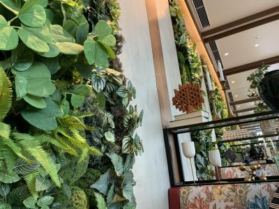 ランチタイムはテラス側の窓を大きく開けていて解放的、店内も緑が多く配置されていて