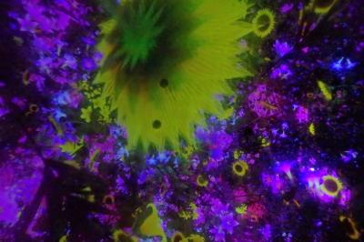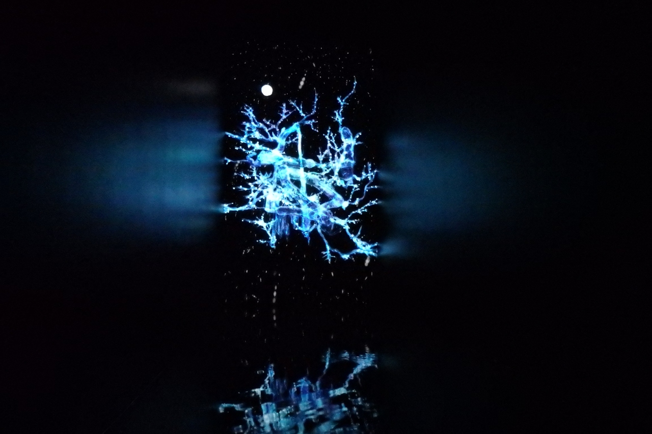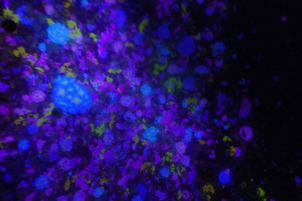 水中を光の鯉が泳ぐ部屋では足元の鯉を目で追いかけたり、