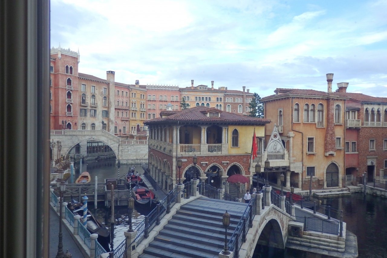 ベネチアンゴンドラのアトラクションの目の前のお部屋に宿泊。パークに入る方と目があってしまうのではないかというくらい近くて感激!夜の閉園後のパークの素敵な夜景など宿泊しないと味わえない経験です。