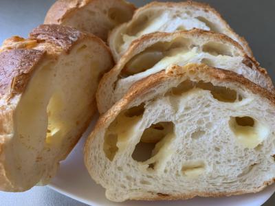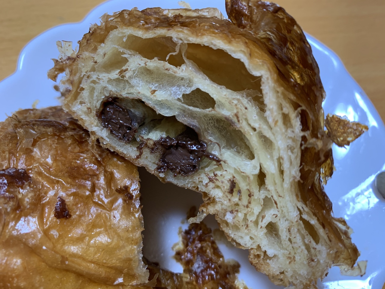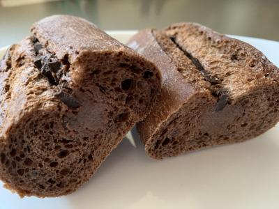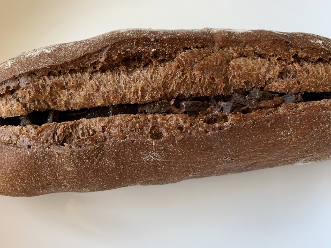 ココア生地のフランスパンに、チョコレートクリームを挟んでさらにそこにダイスのチョコがのっているチョコレートが3食感味わえる。チョコ好きにはたまらないパンです。