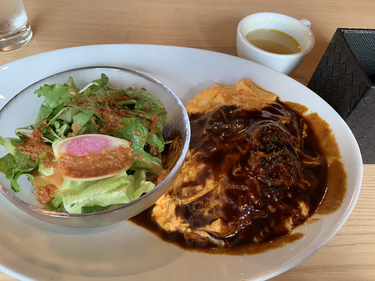 ランチで利用しました。MASAたまオムライス¥800(税込)でサラダ・スープ付きを注文。とろとろ卵のしたには、ひき肉に包まれたライスがあります。ボリュームたっぷり。デミグラスソースかトマトソースか選べます。