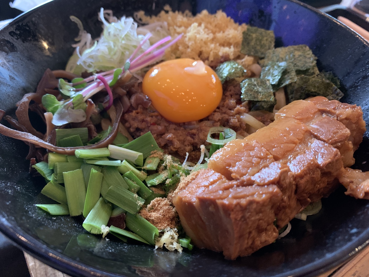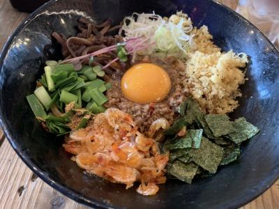 まぜそばは太い麺もちもちでお腹いっぱいになります。にんにく無しにしたせいなのか少し味のインパクトが薄く、味変用においてあるかつお昆布酢を結構いれてしまいました。- 旅行時期