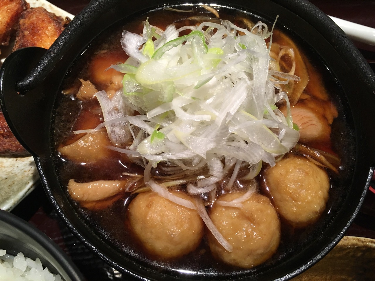 軍鶏鍋と手羽先がセットになっているのを食べました。鍋には軍鶏肉の切り身だけでなく、鶏団子もたくさん入っていて大変満足でした。唐揚げと鶏手羽も美味しく鶏ざんまいできます。