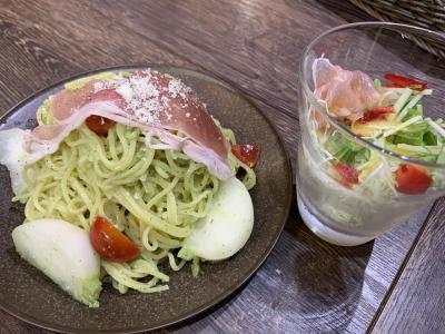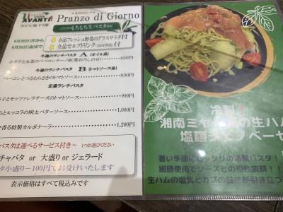 パスタにミニサラダとフリードリンク、デザート(パスタ大盛りかチャバタかジェラートから選べる)付で850円~1200円くらいまであります。