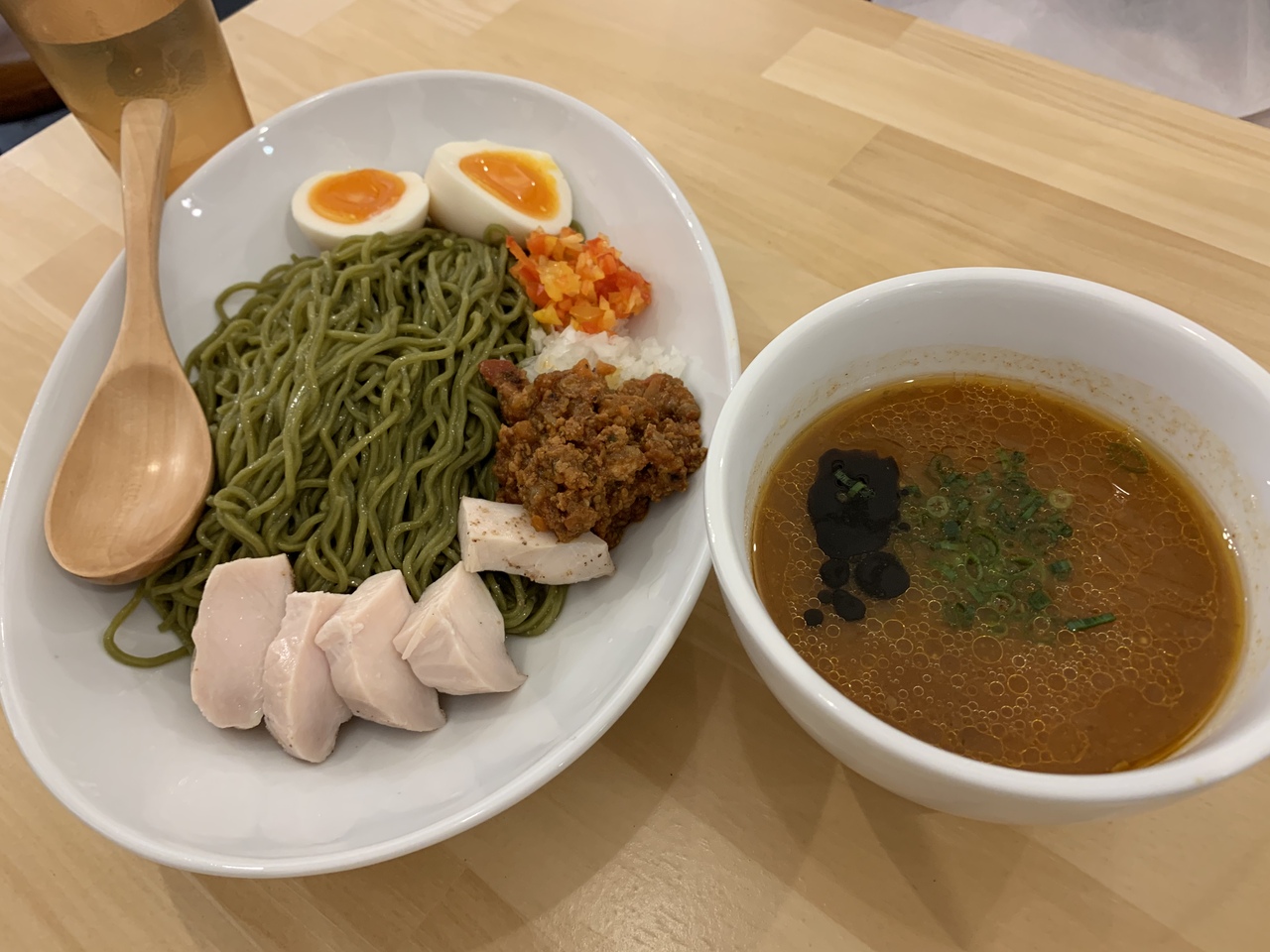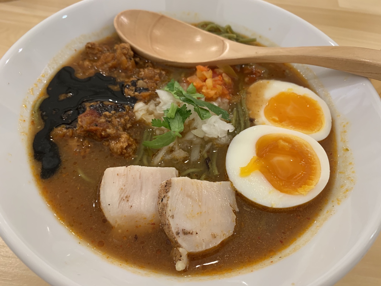 アスリートの方に栄養バランスを考慮したラーメンを提供したいという思いで開発したラーメンだそうです。チリトマトの赤いスープにモリンガを練りこんだ緑色麺が映えます。あっさりとした味です。山椒の辛さが刺激的でした。- 旅行時期
