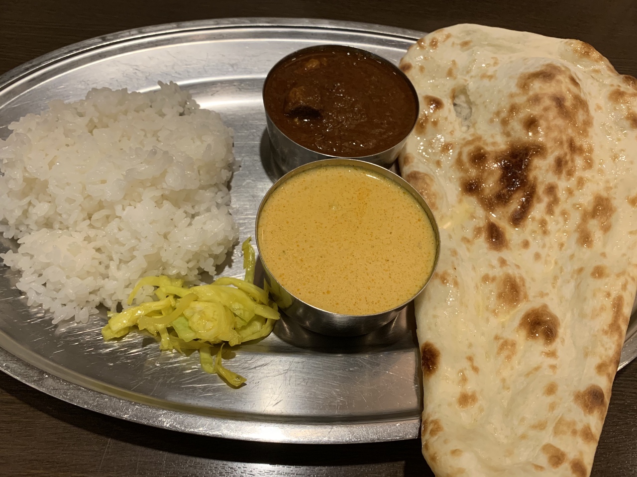 カレー2種類とナン、アチャールのセットを頼みました。