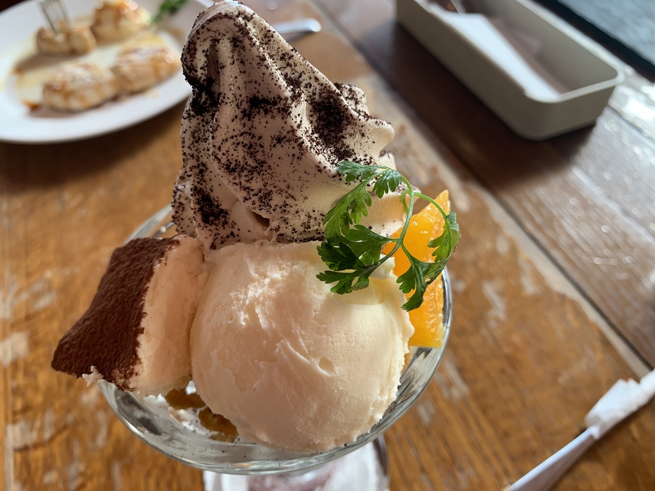 自家焙煎コーヒーパフェはソフトクリーム・アイスクリームにティラミスものっていてかなりボリュームがあります。- 旅行時期