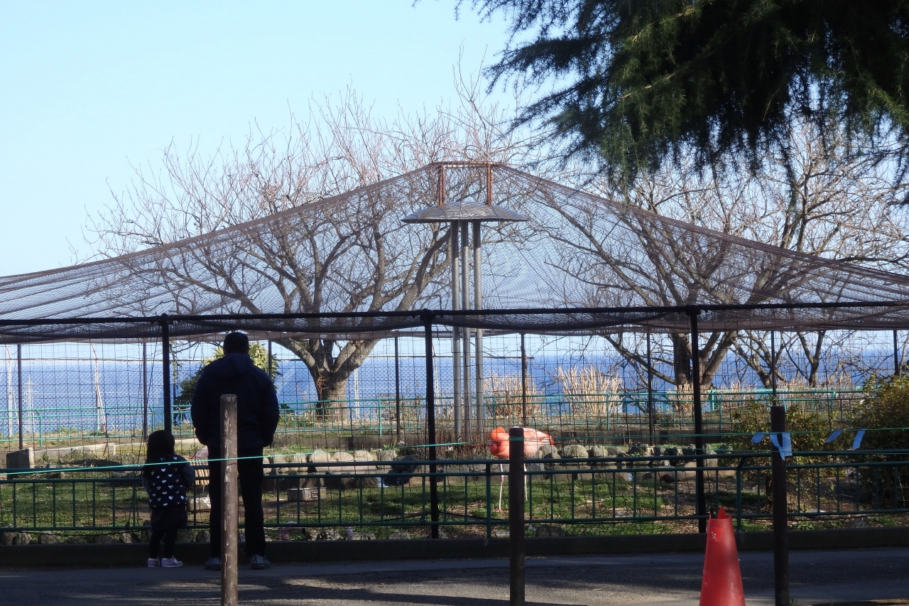 小高い丘の上にあって、動物園から海が見えます。フラミンゴ越しに海が見えるのが良い!