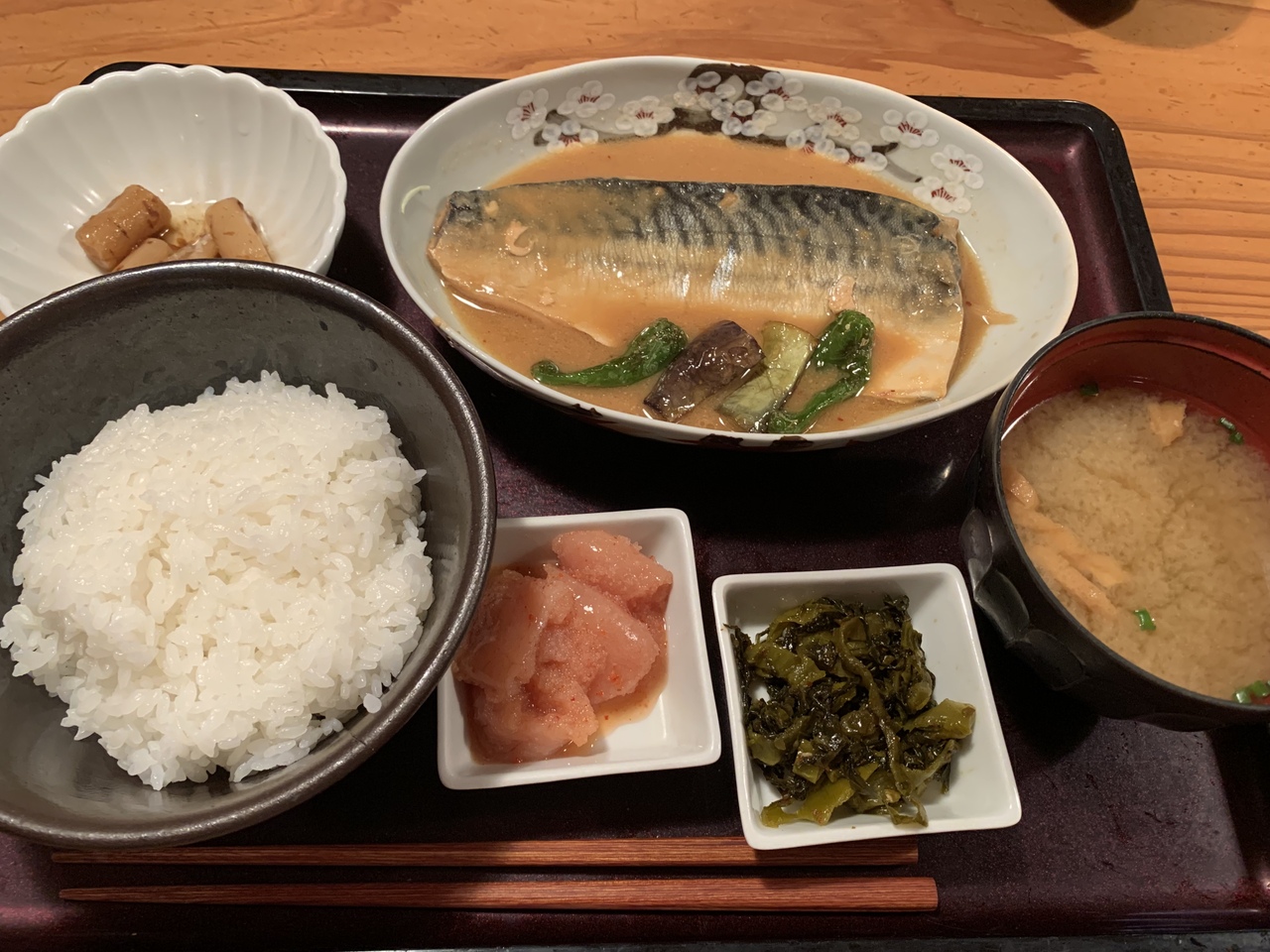 唐揚げ定食を食べている方が一番多いのですが、この日はサバの味噌に定食があったのでそちらにしました。大きなサバの味噌煮だけでご飯が食べ終わってしまいます。明太子も食べたいのでご飯もおかわりしてしまいます。ご飯も美味しくて熱々のものが出て来ます。1300円です。- 旅行時期