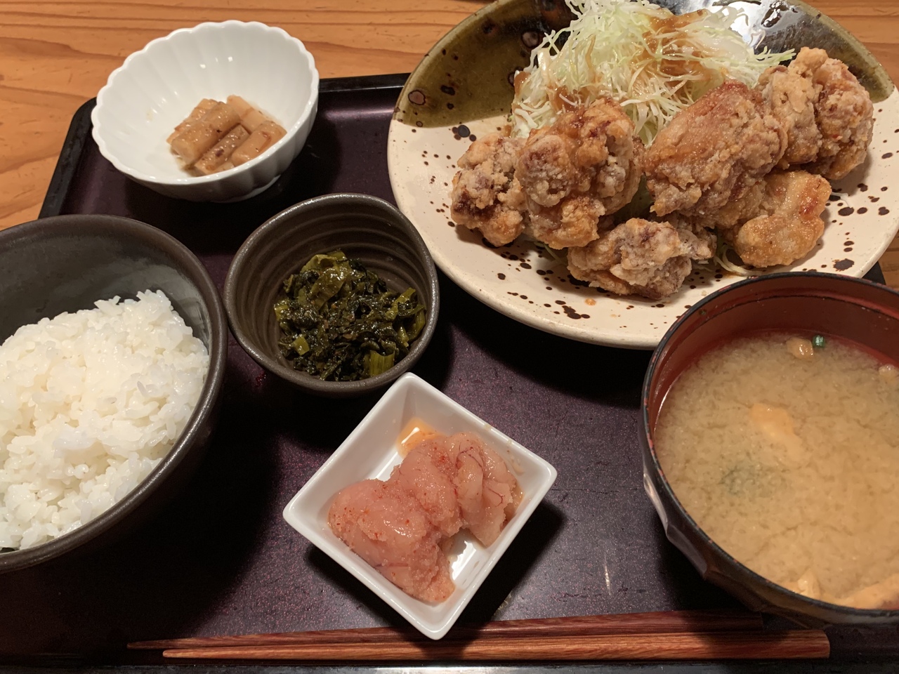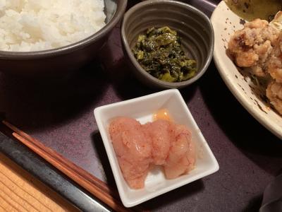 定食に明太子・高菜漬け・ご飯食べ放題が付いた大人気のランチです。コロナ前はテーブルに置いてある入れ物に明太子がたくさん入っていたのですが、店員さんにおかわりを頼んで一人分ずつ小皿で持ってきてもらうスタイルに変わっていました。たっぷり盛って来てくれます。