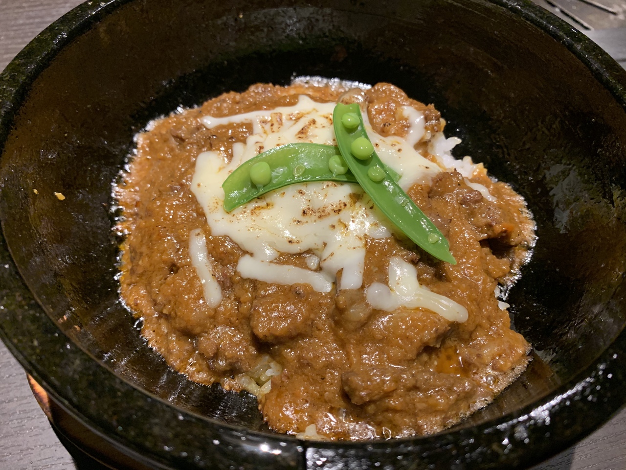 焼きチーズビーフカレーを頼みました、石焼きで熱々で油がはねます、熱い(笑)