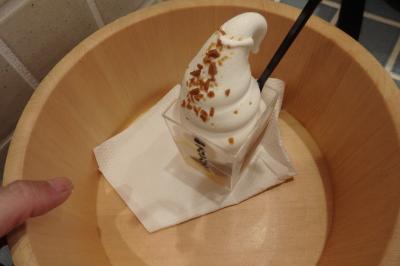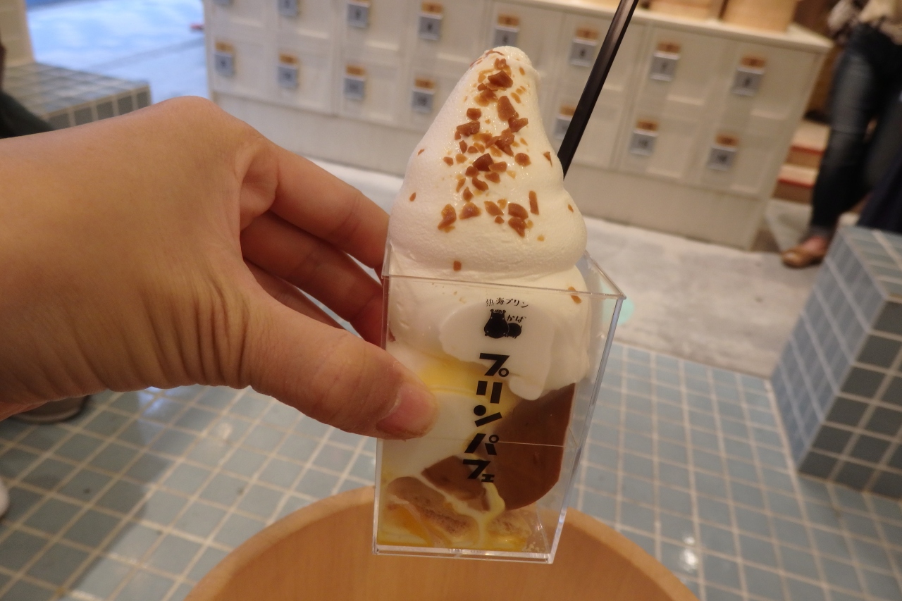 美味しい、ふわっとしたソフトクリームがプリンの上にのっています、スイーツ好きにはたまらない感じです。